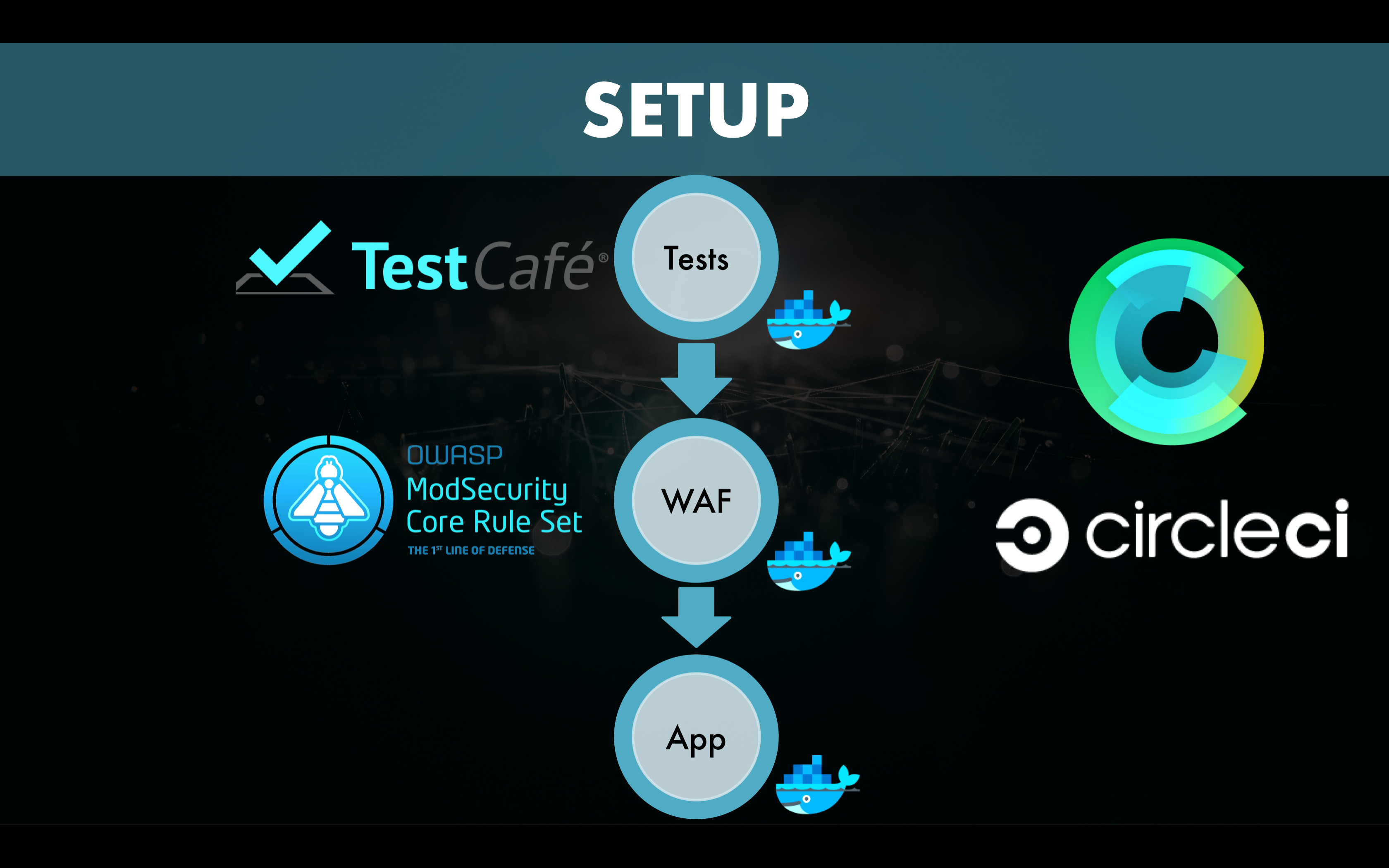 - Each commit of the application code into the repository triggers a continuous integration run. This launches the application, starts the WAF and runs the application tests.